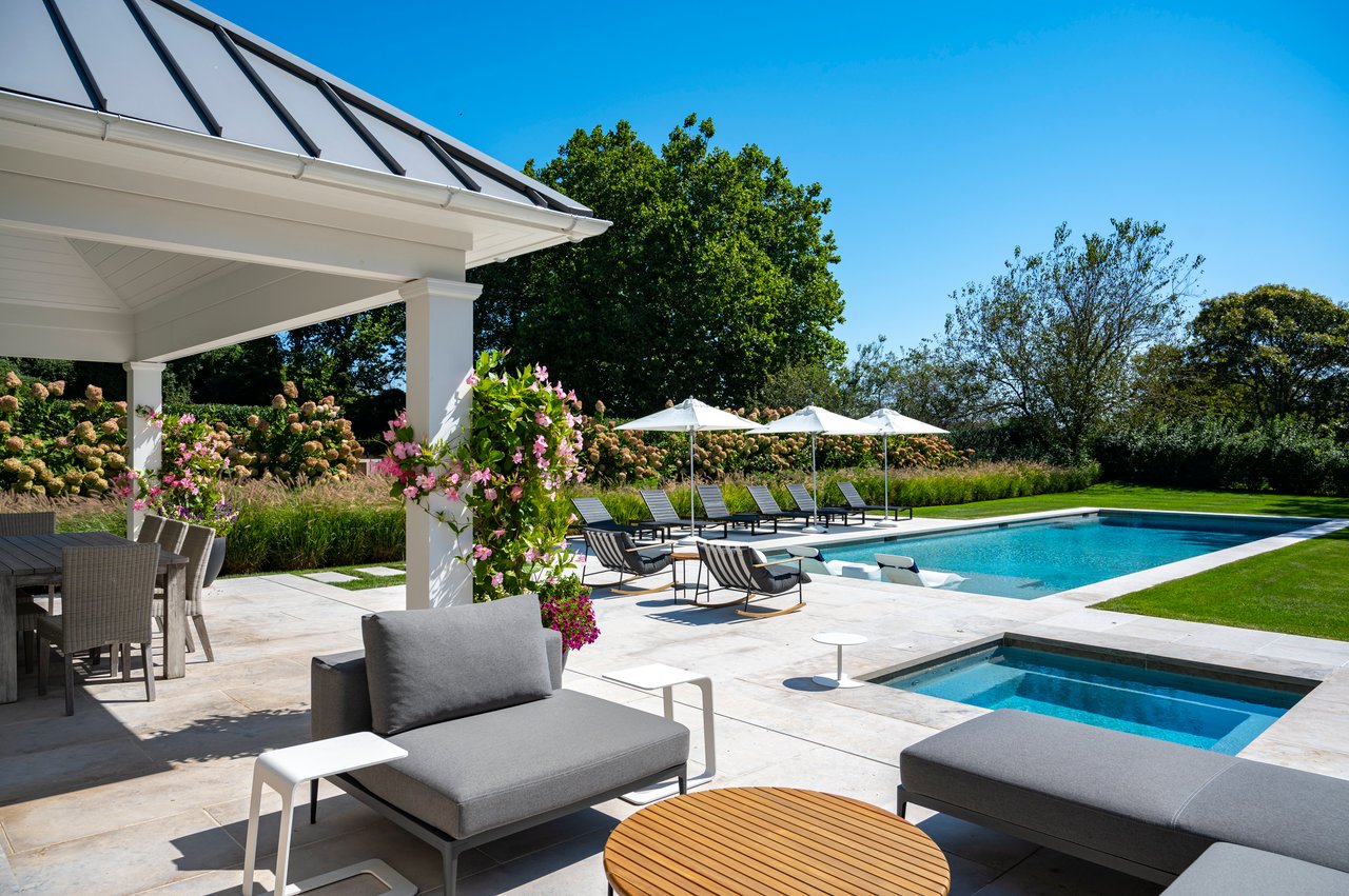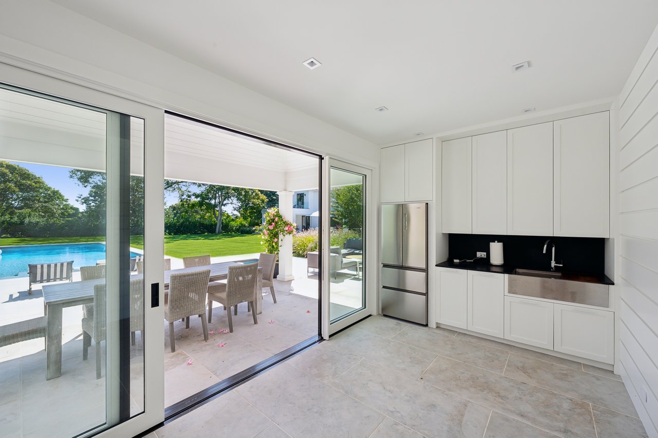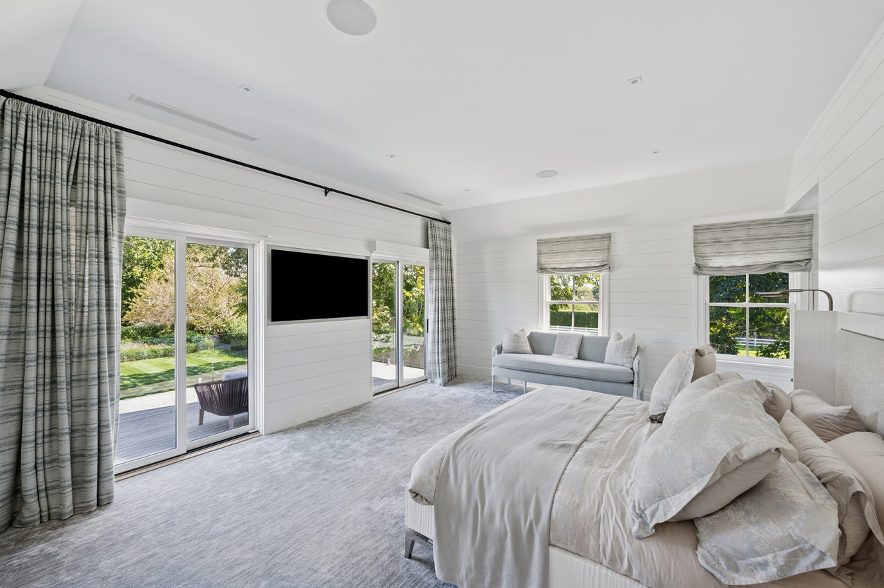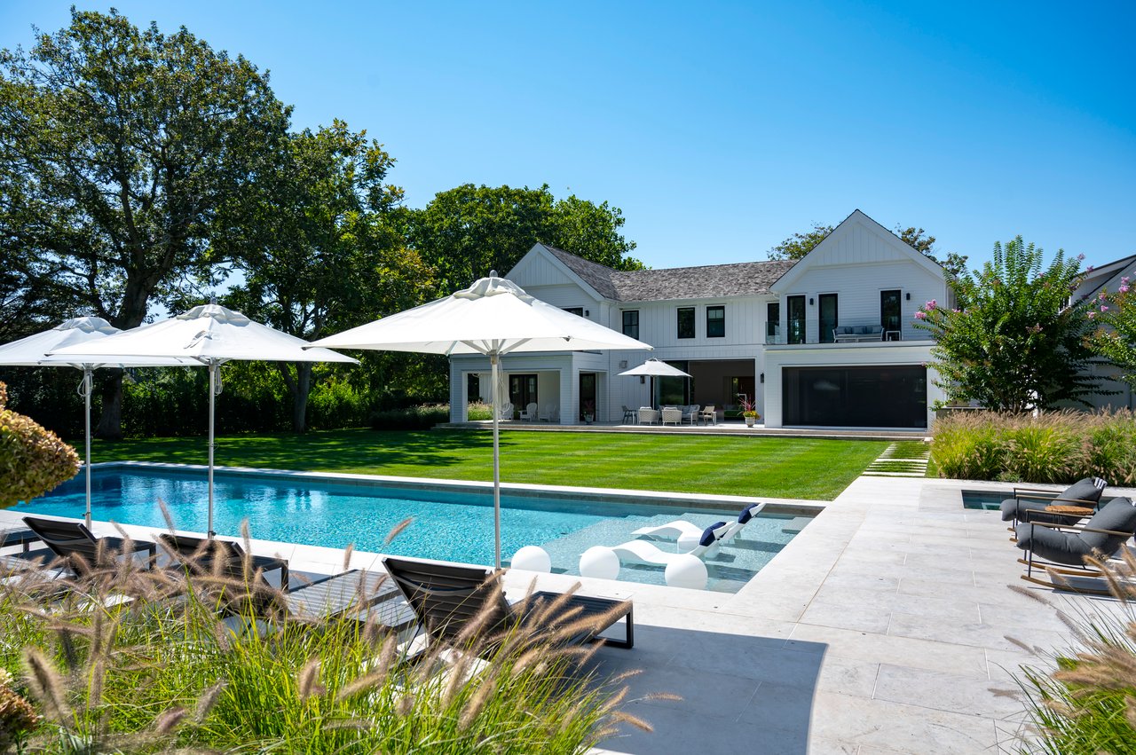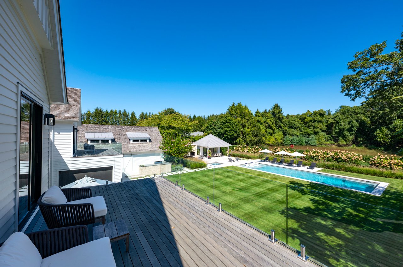 Set on almost two acres and bordered by a horse farm, this extraordinary 8,670± SF estate on Town Line Road blends timeless architecture with modern luxury. Stunning landscape, created by the renowned firm, Laguardia Design Group, emphasizes privacy and tranquility, the property is located just 1.5± miles from the Atlantic Ocean. Custom-built to the highest standards utilizing hard wood floors and custom millwork throughout, the residence offers 8 bedrooms, 8 full baths, and 2 half baths. The dramatic great room features soaring vaulted ceilings and a double-sided fireplace shared with an elegant dining room. The living room has floor-to-ceiling sliding glass doors that open to the outside patio promoting resort-style outdoor living, while a screened porch opens to the kitchen with automated screens provides a seamless indoor-outdoor experience. The spacious open kitchen has top of the line Sub-zero/ Wolf/ Miele appliances, with a large 12 foot center island, counter seating, and a great flow to the living room and family room, is designed for effortless entertaining. Both the second floor primary suite and the first-floor guest suite offers a serene retreat, featuring a spa-like experience with an oversized shower with tile throughout and natural stone flooring, a freestanding tub, and ample walk-in closets. The lower level is dedicated to wellness and leisure, including a gym, an marble steam room, dry sauna, rec room, 2 bedrooms, one of which is a bunk room and generous storage space. Additional amenities include a three-car garage with direct access to the house. Outdoor amenities include a 18' x 54' heated gunite pool with a Baja sunshelf and a 10 person hot tub, complemented by a well appointed pool house with kitchenette and bathroom, limestone patios, and an outdoor fireplace-ideal for summer gatherings. The property has room for a padel court. The home's fully integrated automation systems provide controls for all aspects of the house including front gates, music in and outside, solar panel array and backup generator for total entertainment, sustainability and security. [[Rental Registration # Pending]]