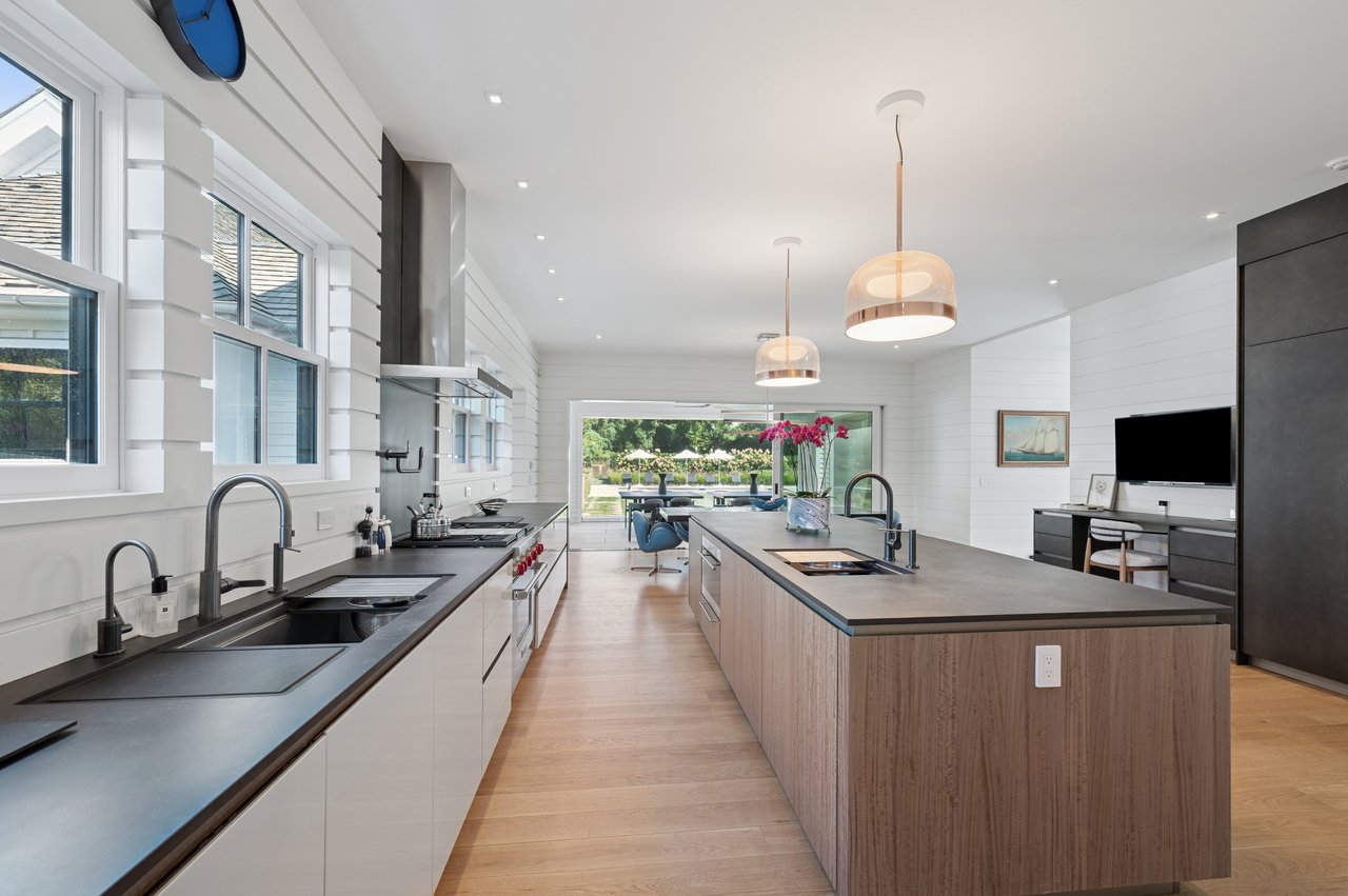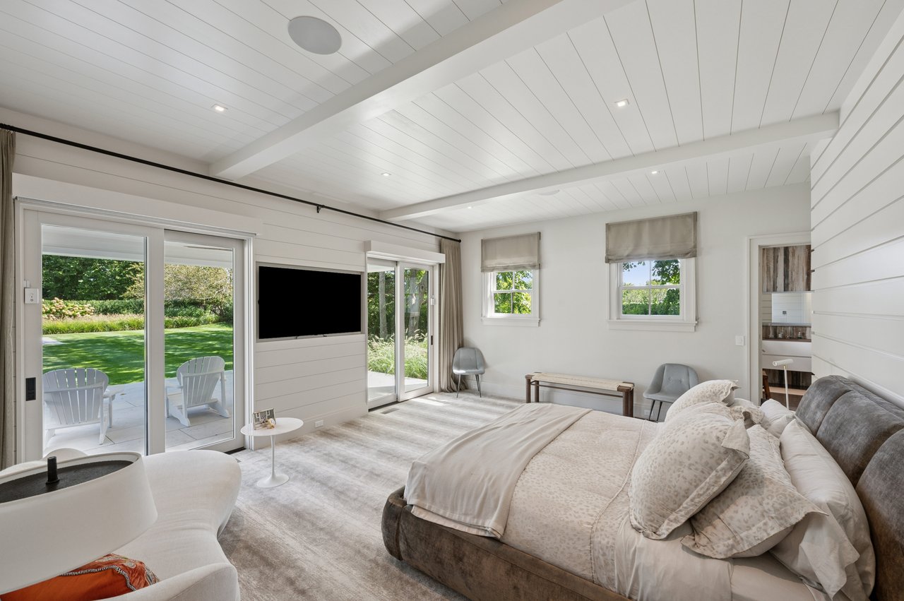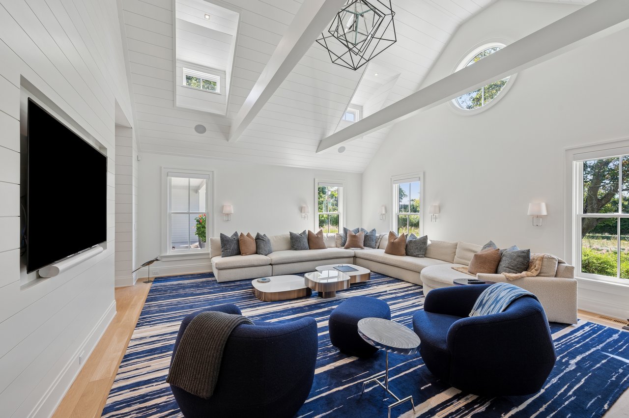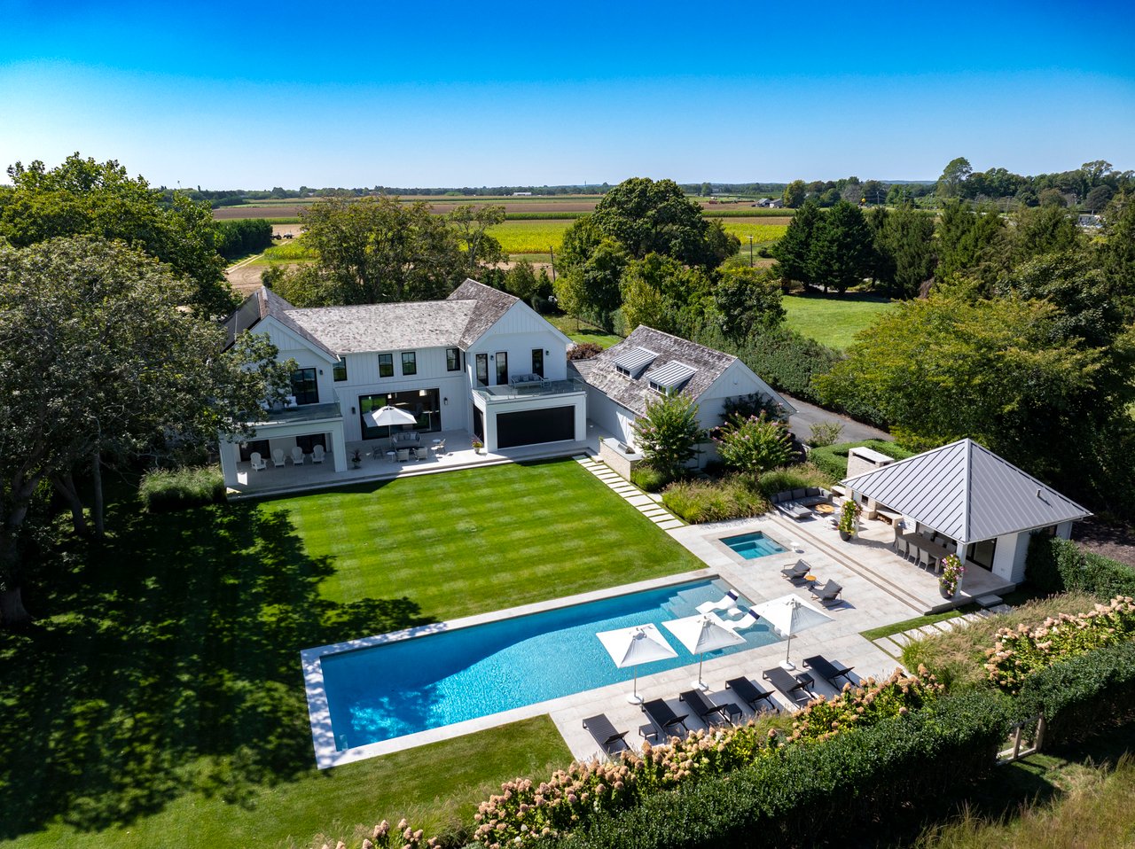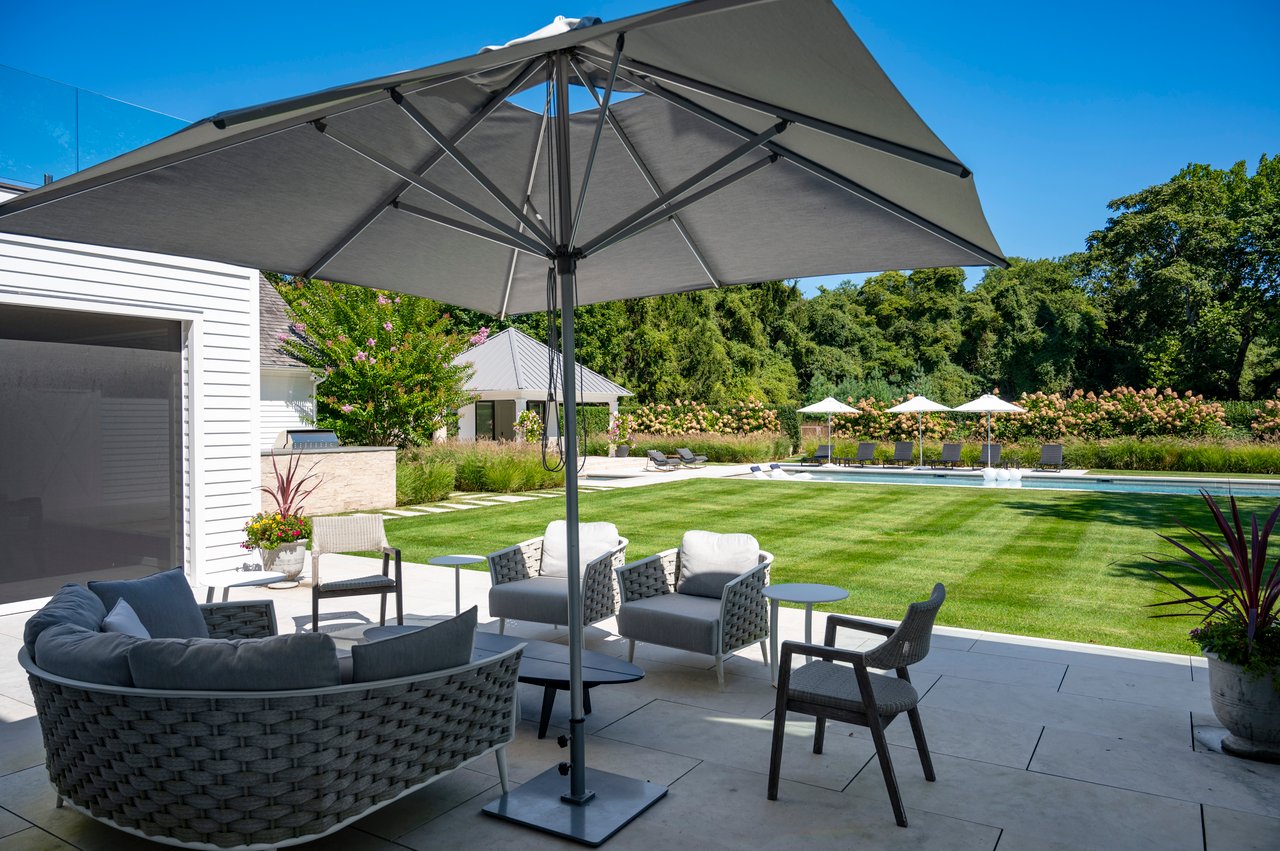 Set on almost two acres and bordered by a horse farm, this extraordinary 8,670± SF estate on Town Line Road blends timeless architecture with modern luxury. Stunning landscape, created by the renowned firm, Laguardia Design Group, emphasizes privacy and tranquility, the property is located just 1.5± miles from the Atlantic Ocean. Custom-built to the highest standards utilizing hard wood floors and custom millwork throughout, the residence offers 8 bedrooms, 8 full baths, and 2 half baths. The dramatic great room features soaring vaulted ceilings and a double-sided fireplace shared with an elegant dining room. The living room has floor-to-ceiling sliding glass doors that open to the outside patio promoting resort-style outdoor living, while a screened porch opens to the kitchen with automated screens provides a seamless indoor-outdoor experience. The spacious open kitchen has top of the line Sub-zero/ Wolf/ Miele appliances, with a large 12 foot center island, counter seating, and a great flow to the living room and family room, is designed for effortless entertaining. Both the second floor primary suite and the first-floor guest suite offers a serene retreat, featuring a spa-like experience with an oversized shower with tile throughout and natural stone flooring, a freestanding tub, and ample walk-in closets. The lower level is dedicated to wellness and leisure, including a gym, an marble steam room, dry sauna, rec room, 2 bedrooms, one of which is a bunk room and generous storage space. Additional amenities include a three-car garage with direct access to the house. Outdoor amenities include a 18' x 54' heated gunite pool with a Baja sunshelf and a 10 person hot tub, complemented by a well appointed pool house with kitchenette and bathroom, limestone patios, and an outdoor fireplace-ideal for summer gatherings. The property has room for a padel court. The home's fully integrated automation systems provide controls for all aspects of the house including front gates, music in and outside, solar panel array and backup generator for total entertainment, sustainability and security. [[Rental Registration # Pending]]