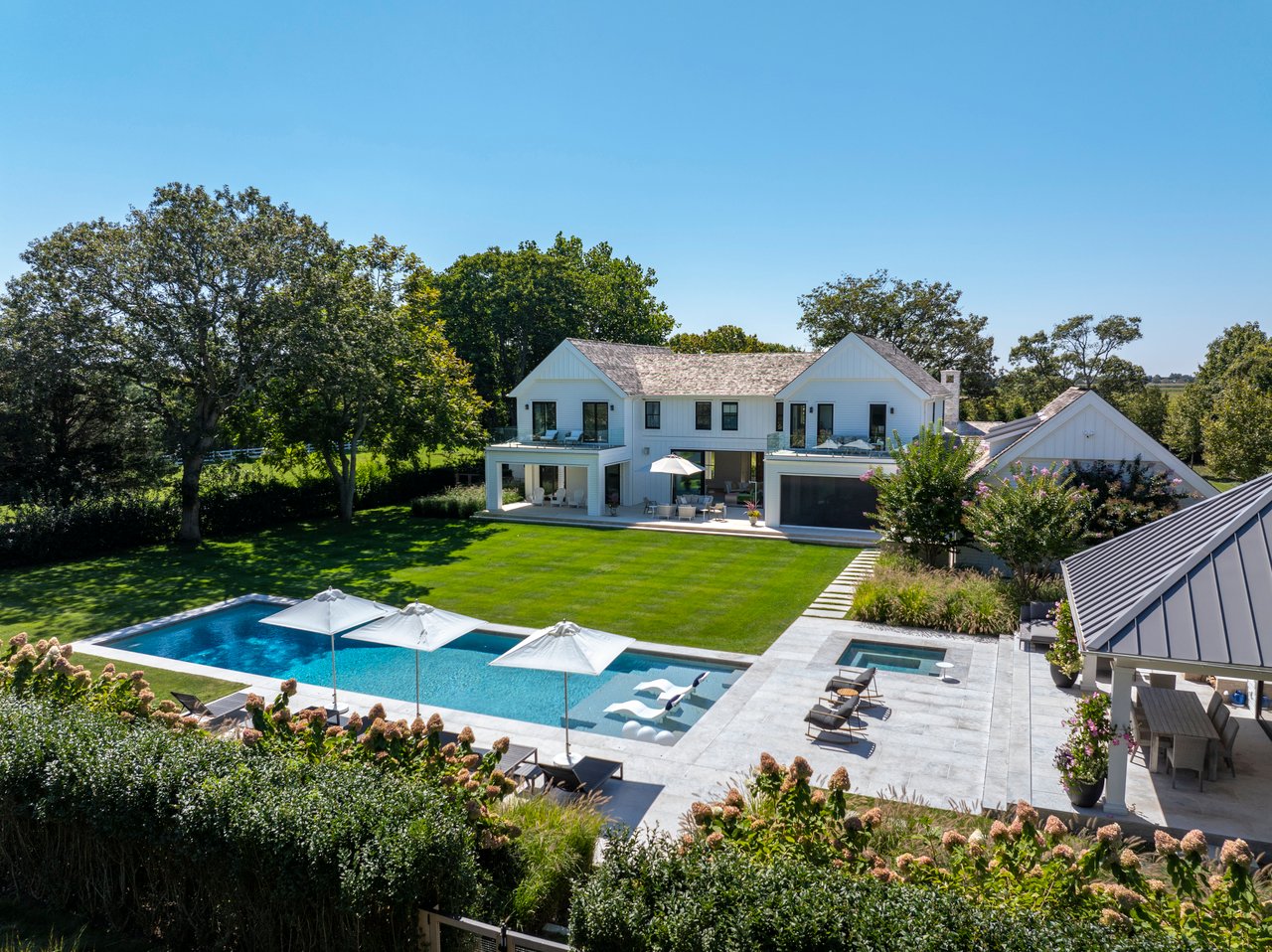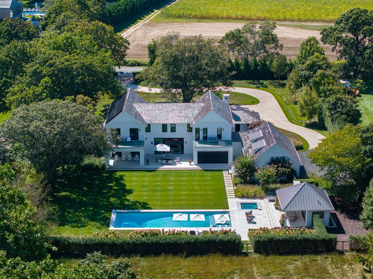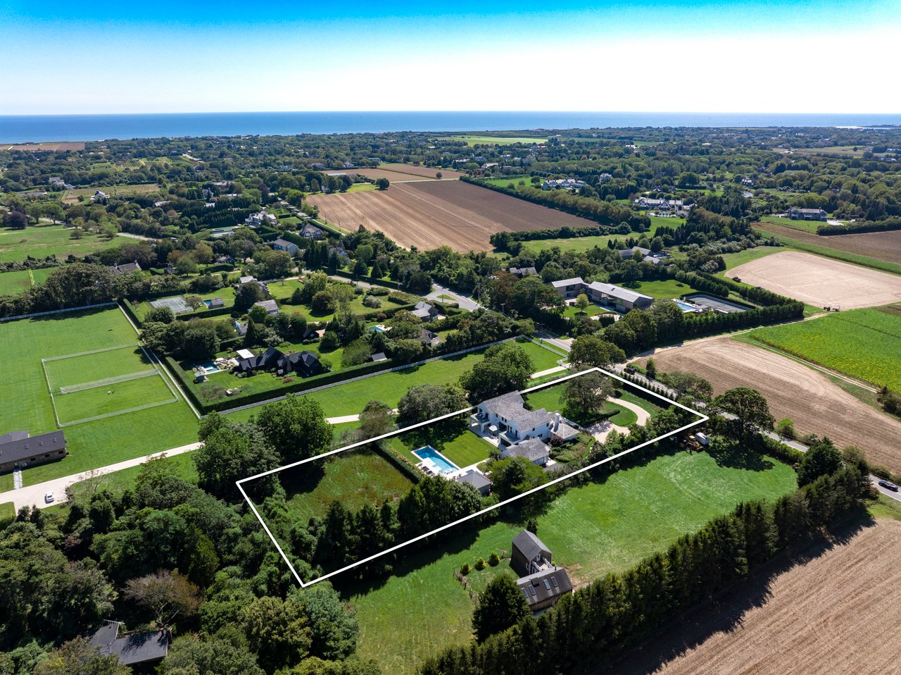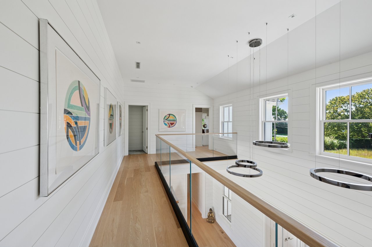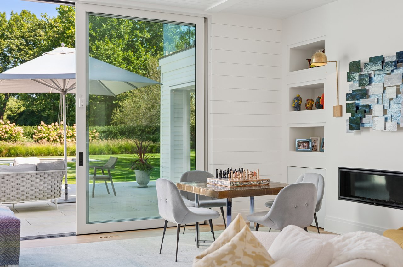 Set on almost two acres and bordered by a horse farm, this extraordinary 8,670± SF estate on Town Line Road blends timeless architecture with modern luxury. Stunning landscape, created by the renowned firm, Laguardia Design Group, emphasizes privacy and tranquility, the property is located just 1.5± miles from the Atlantic Ocean. Custom-built to the highest standards utilizing hard wood floors and custom millwork throughout, the residence offers 8 bedrooms, 8 full baths, and 2 half baths. The dramatic great room features soaring vaulted ceilings and a double-sided fireplace shared with an elegant dining room. The living room has floor-to-ceiling sliding glass doors that open to the outside patio promoting resort-style outdoor living, while a screened porch opens to the kitchen with automated screens provides a seamless indoor-outdoor experience. The spacious open kitchen has top of the line Sub-zero/ Wolf/ Miele appliances, with a large 12 foot center island, counter seating, and a great flow to the living room and family room, is designed for effortless entertaining. Both the second floor primary suite and the first-floor guest suite offers a serene retreat, featuring a spa-like experience with an oversized shower with tile throughout and natural stone flooring, a freestanding tub, and ample walk-in closets. The lower level is dedicated to wellness and leisure, including a gym, an marble steam room, dry sauna, rec room, 2 bedrooms, one of which is a bunk room and generous storage space. Additional amenities include a three-car garage with direct access to the house. Outdoor amenities include a 18' x 54' heated gunite pool with a Baja sunshelf and a 10 person hot tub, complemented by a well appointed pool house with kitchenette and bathroom, limestone patios, and an outdoor fireplace-ideal for summer gatherings. The property has room for a padel court. The home's fully integrated automation systems provide controls for all aspects of the house including front gates, music in and outside, solar panel array and backup generator for total entertainment, sustainability and security. [[Rental Registration # Pending]]