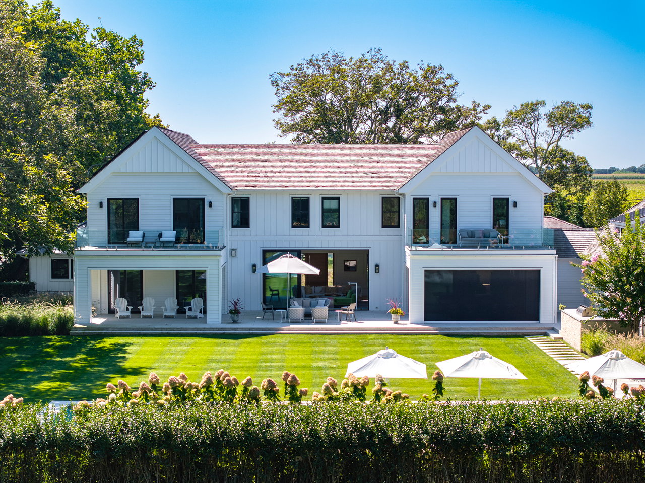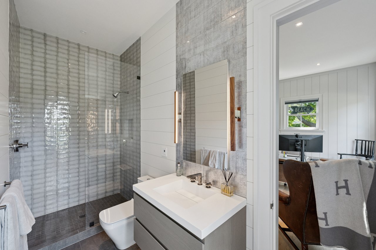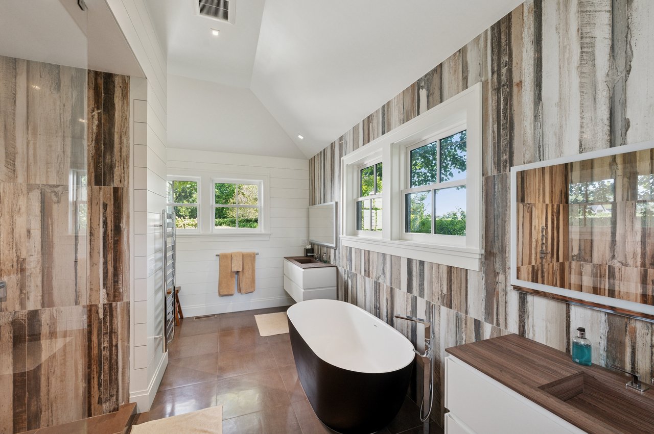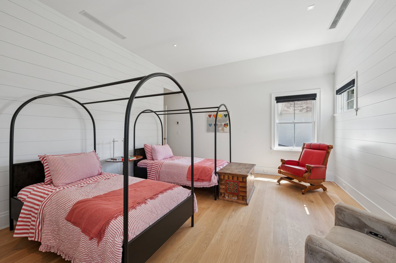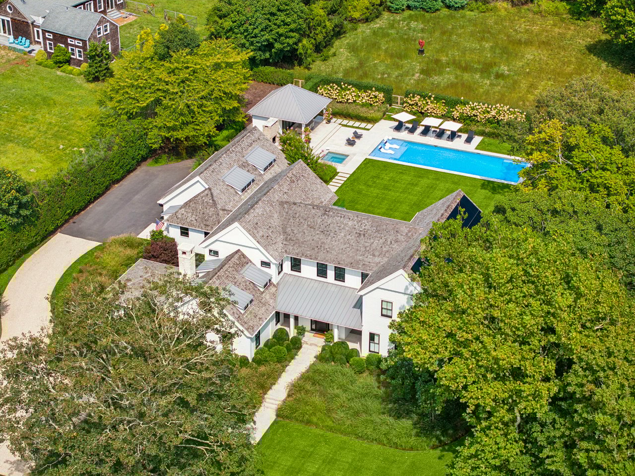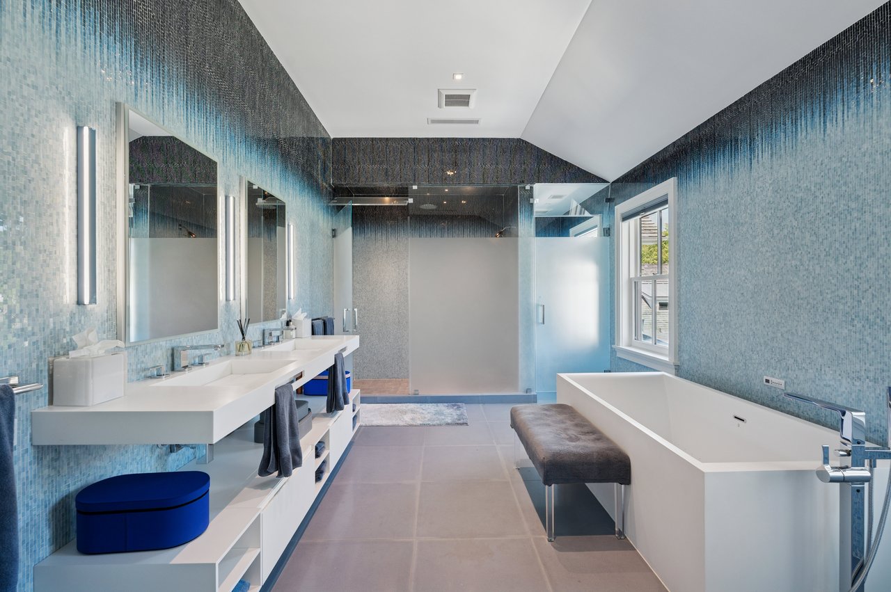 Set on almost two acres and bordered by a horse farm, this extraordinary 8,670± SF estate on Town Line Road blends timeless architecture with modern luxury. Stunning landscape, created by the renowned firm, Laguardia Design Group, emphasizes privacy and tranquility, the property is located just 1.5± miles from the Atlantic Ocean. Custom-built to the highest standards utilizing hard wood floors and custom millwork throughout, the residence offers 8 bedrooms, 8 full baths, and 2 half baths. The dramatic great room features soaring vaulted ceilings and a double-sided fireplace shared with an elegant dining room. The living room has floor-to-ceiling sliding glass doors that open to the outside patio promoting resort-style outdoor living, while a screened porch opens to the kitchen with automated screens provides a seamless indoor-outdoor experience. The spacious open kitchen has top of the line Sub-zero/ Wolf/ Miele appliances, with a large 12 foot center island, counter seating, and a great flow to the living room and family room, is designed for effortless entertaining. Both the second floor primary suite and the first-floor guest suite offers a serene retreat, featuring a spa-like experience with an oversized shower with tile throughout and natural stone flooring, a freestanding tub, and ample walk-in closets. The lower level is dedicated to wellness and leisure, including a gym, an marble steam room, dry sauna, rec room, 2 bedrooms, one of which is a bunk room and generous storage space. Additional amenities include a three-car garage with direct access to the house. Outdoor amenities include a 18' x 54' heated gunite pool with a Baja sunshelf and a 10 person hot tub, complemented by a well appointed pool house with kitchenette and bathroom, limestone patios, and an outdoor fireplace-ideal for summer gatherings. The property has room for a padel court. The home's fully integrated automation systems provide controls for all aspects of the house including front gates, music in and outside, solar panel array and backup generator for total entertainment, sustainability and security. [[Rental Registration # Pending]]