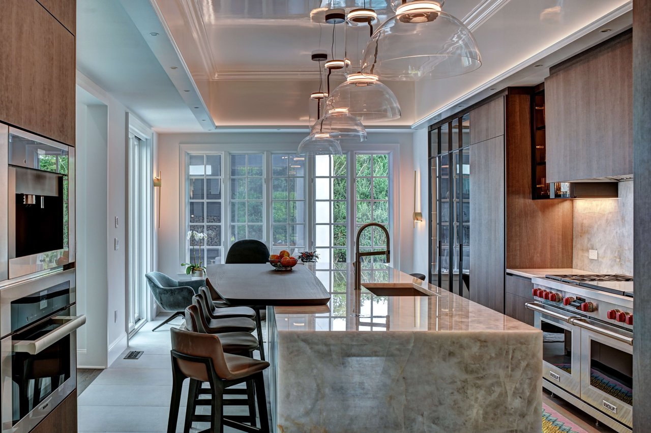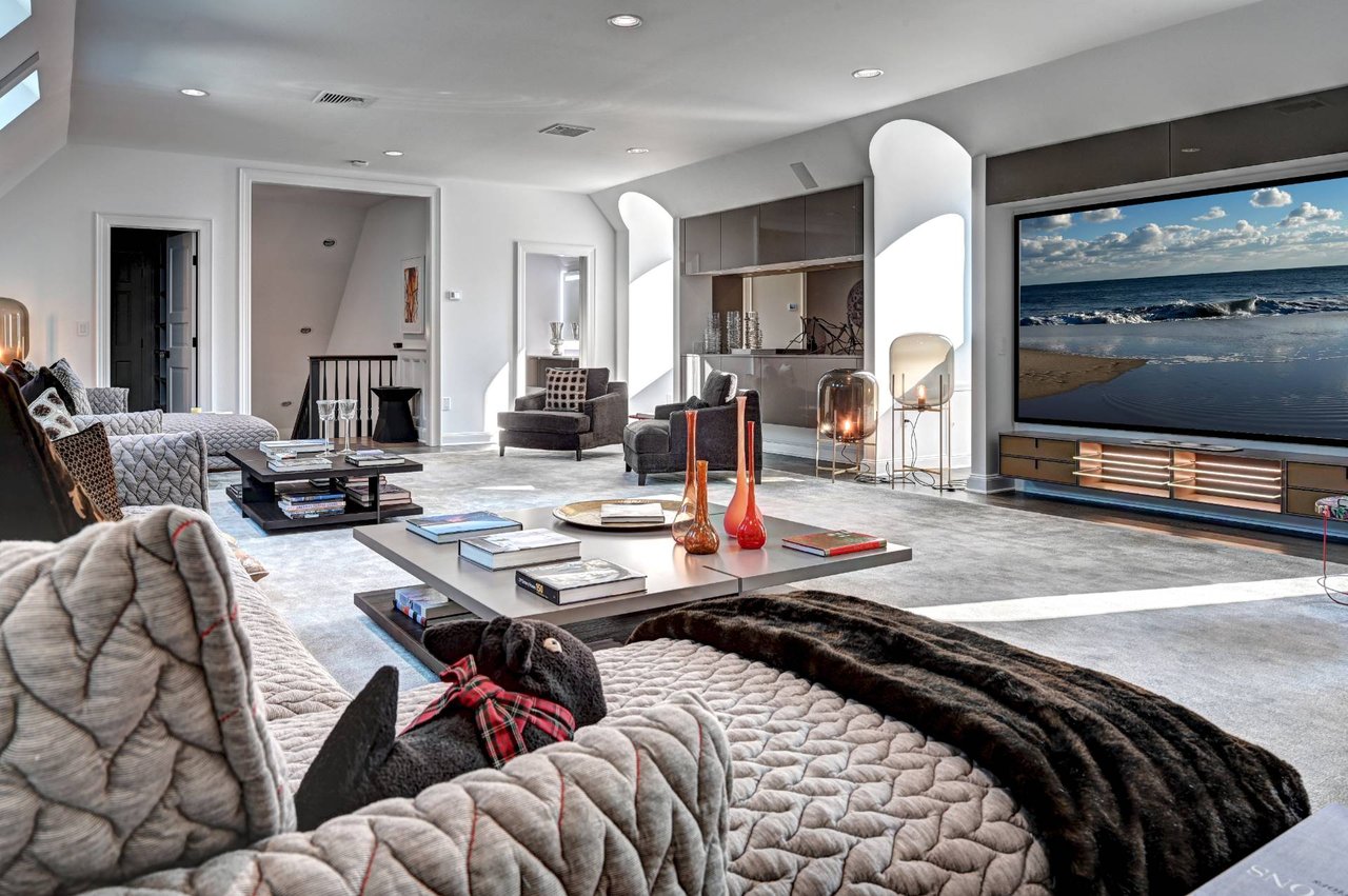 The kitchen features bespoke Poliform/Varenna cabinetry, Wolf and Miele appliances, a butler's pantry, and an adjacent lounge designed for informal gathering. An expansive upstairs media room spanning over 30 feet includes a projection theater, wet bar, full bath, and motorized blackout shades-ideal for relaxed evenings or entertaining on a larger scale.