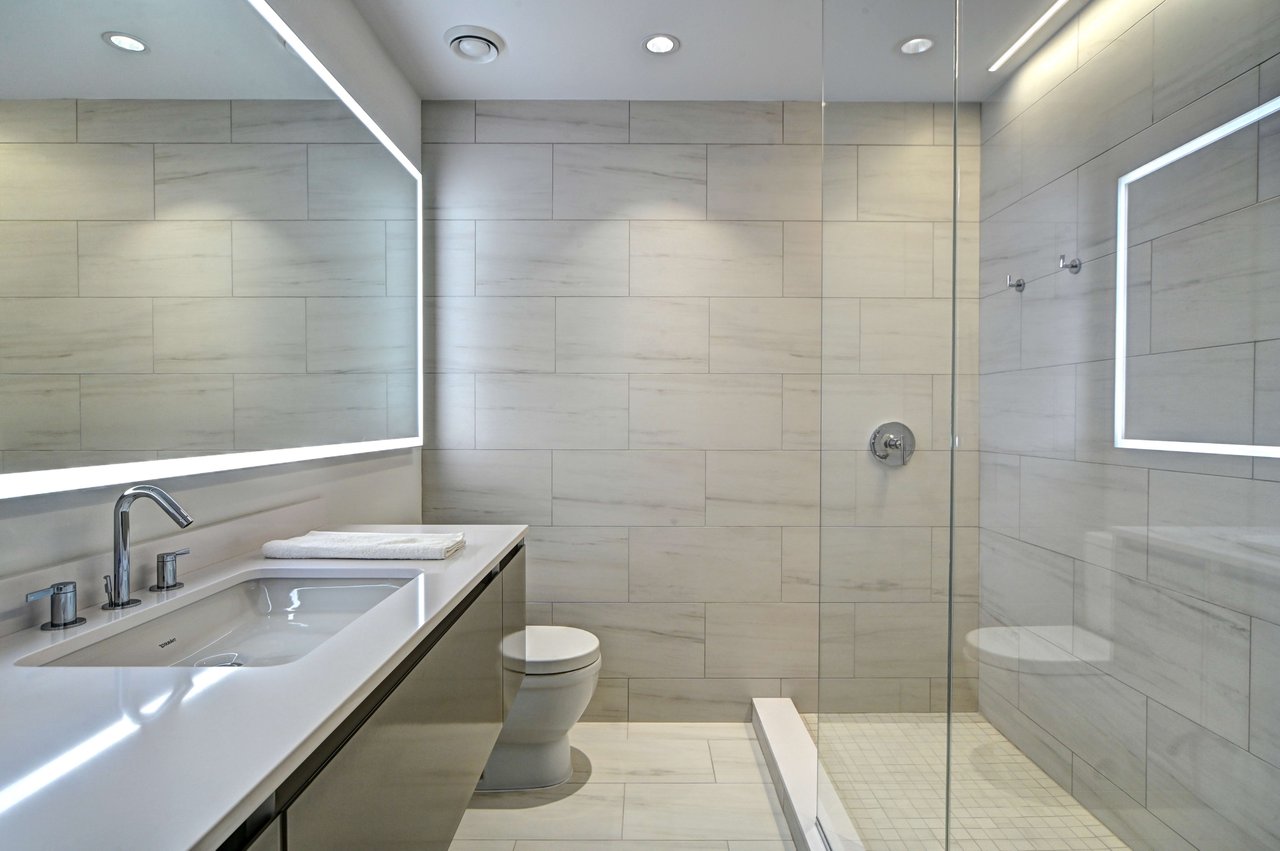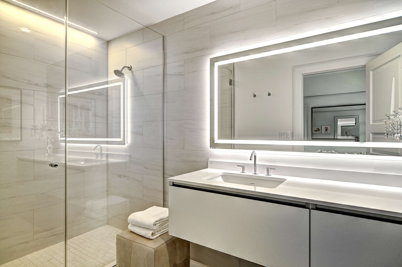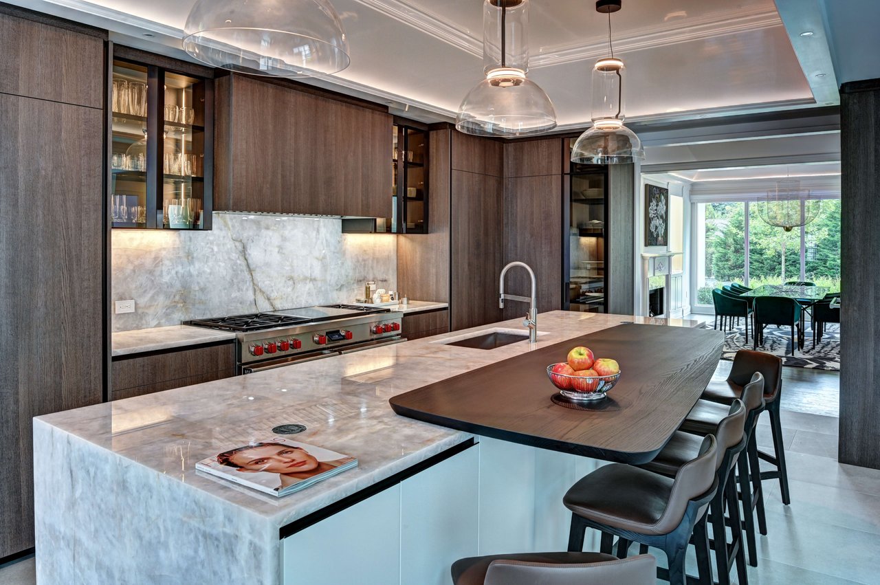 The dining room is anchored by illuminated Italian stone wall panels, floating glass shelving, and refined custom detailing.