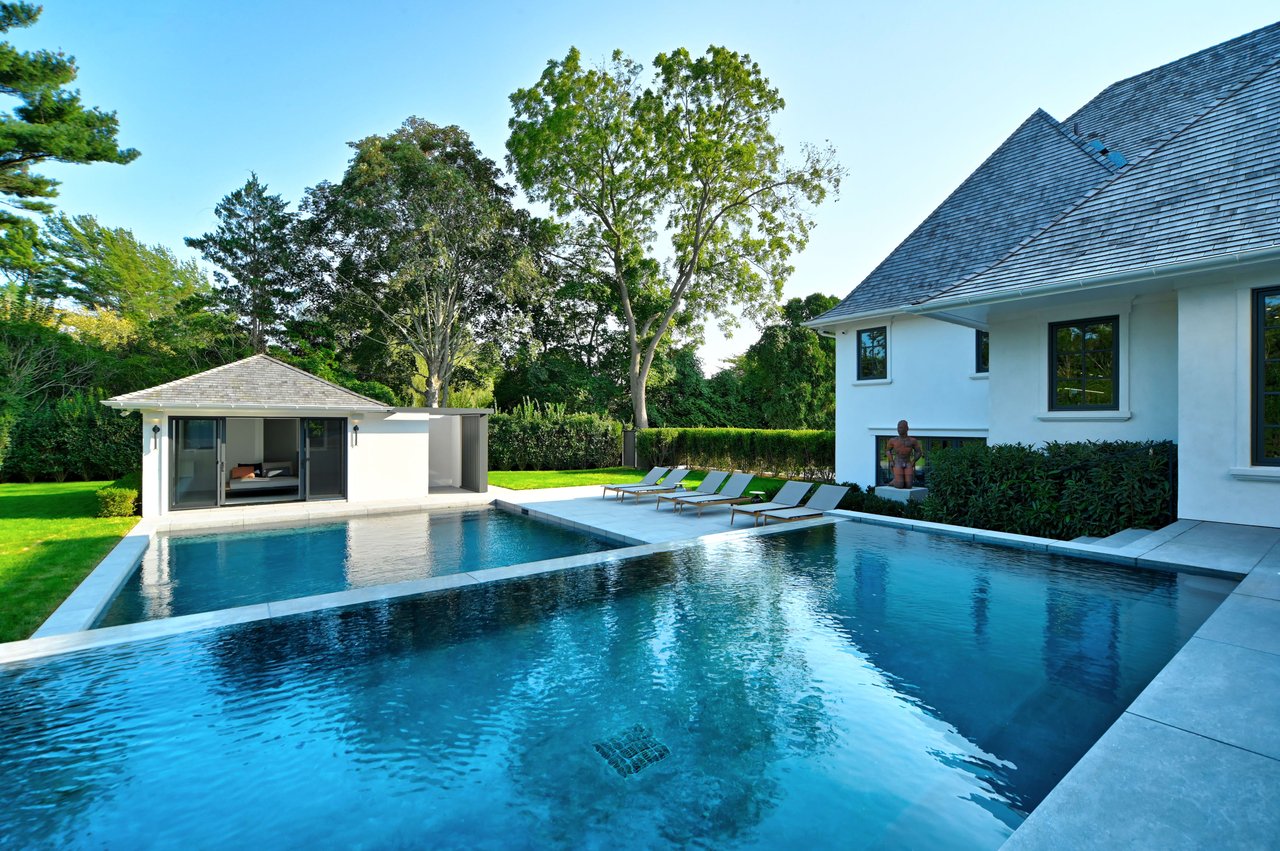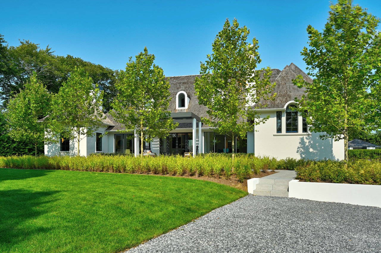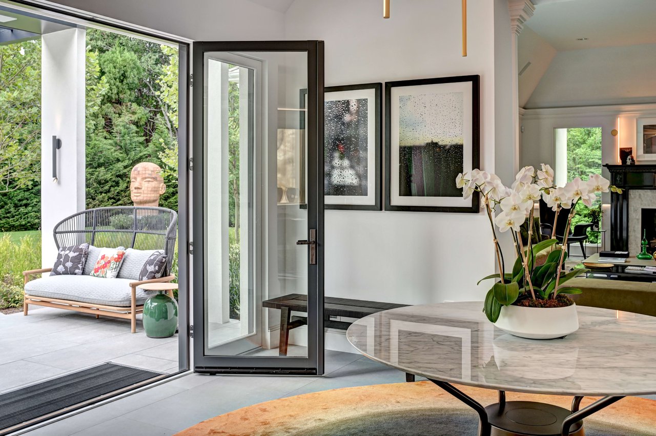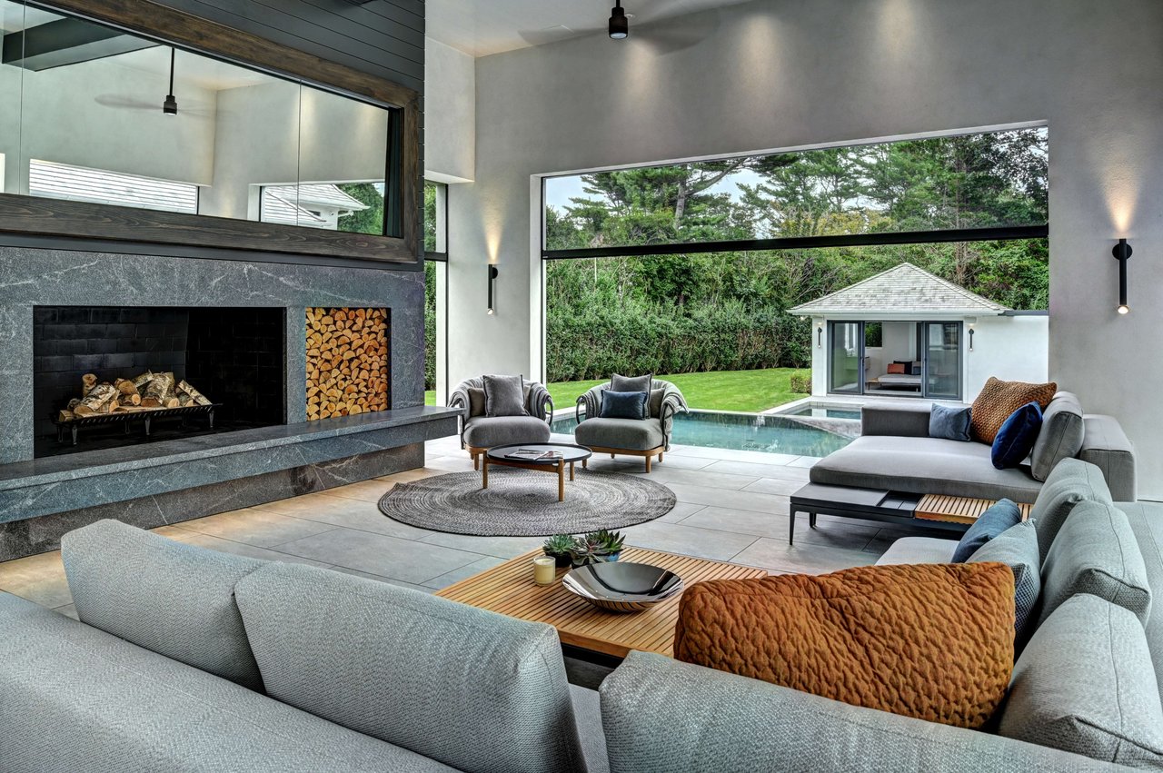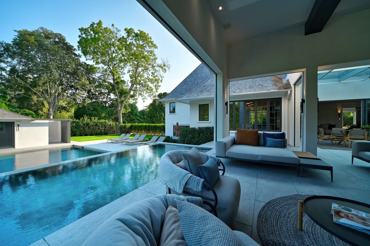 Occupying a premier position on Hither Lane-widely regarded as one of the most beautiful and private streets in the Hamptons-the estate enjoys exceptional walkability. Three ocean beaches, The Maidstone Club, village restaurants, shopping, coffee, golf, and The Jitney are all within easy reach, allowing residents to avoid summer traffic entirely-an uncommon and highly valued advantage in East Hampton. Privately gated and approached via a long, tree-lined allée, the property unfolds behind custom steel entry gates into a fully enclosed landscape of mature plantings, offering a remarkable degree of privacy, security, and quiet. Architecture & Design Spanning approximately 8,000 square feet, the residence presents a refined architectural dialogue between classic Hamptons craftsmanship and contemporary design. Traditional detailing is executed with precision, while modern elements introduce lightness, scale, and understated sophistication. Natural materials, bespoke millwork, and tailored finishes define the interiors. Glass curtain walls, soaring ceilings, and carefully proportioned volumes create a seamless flow that supports both elegant entertaining and relaxed daily living. Interiors The main level is open yet thoughtfully structured, allowing each space to feel distinct while flowing effortlessly from one to the next.