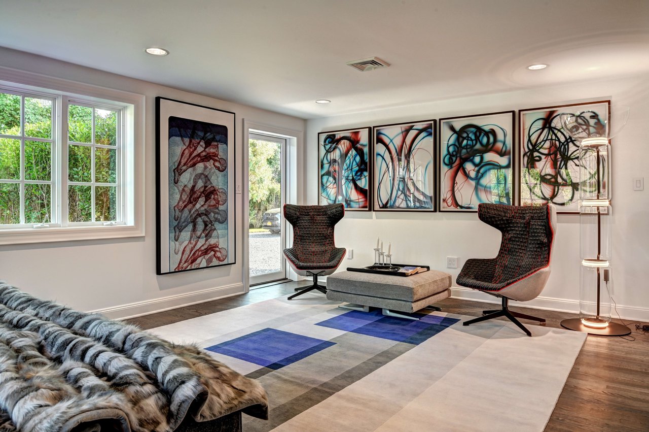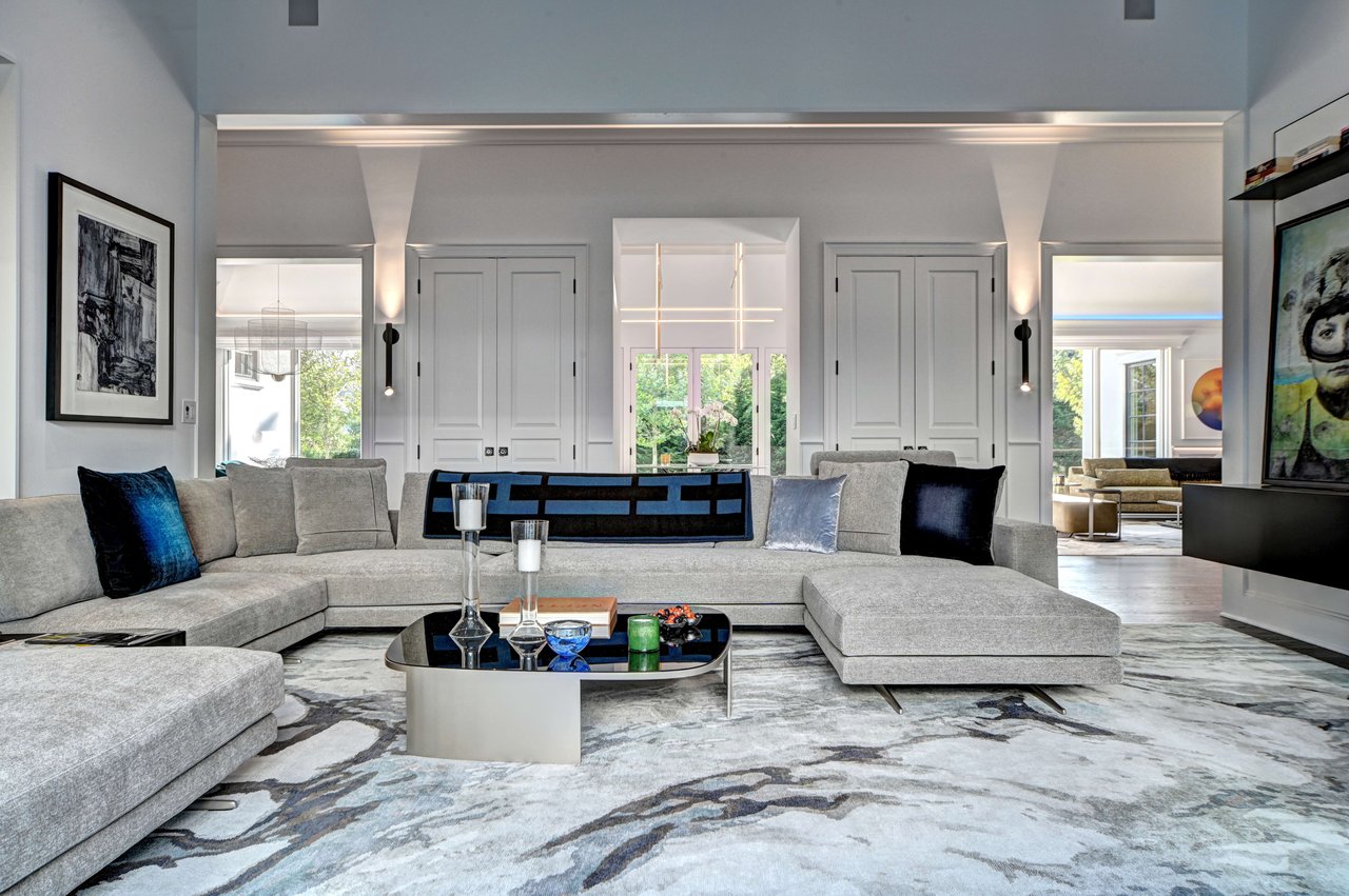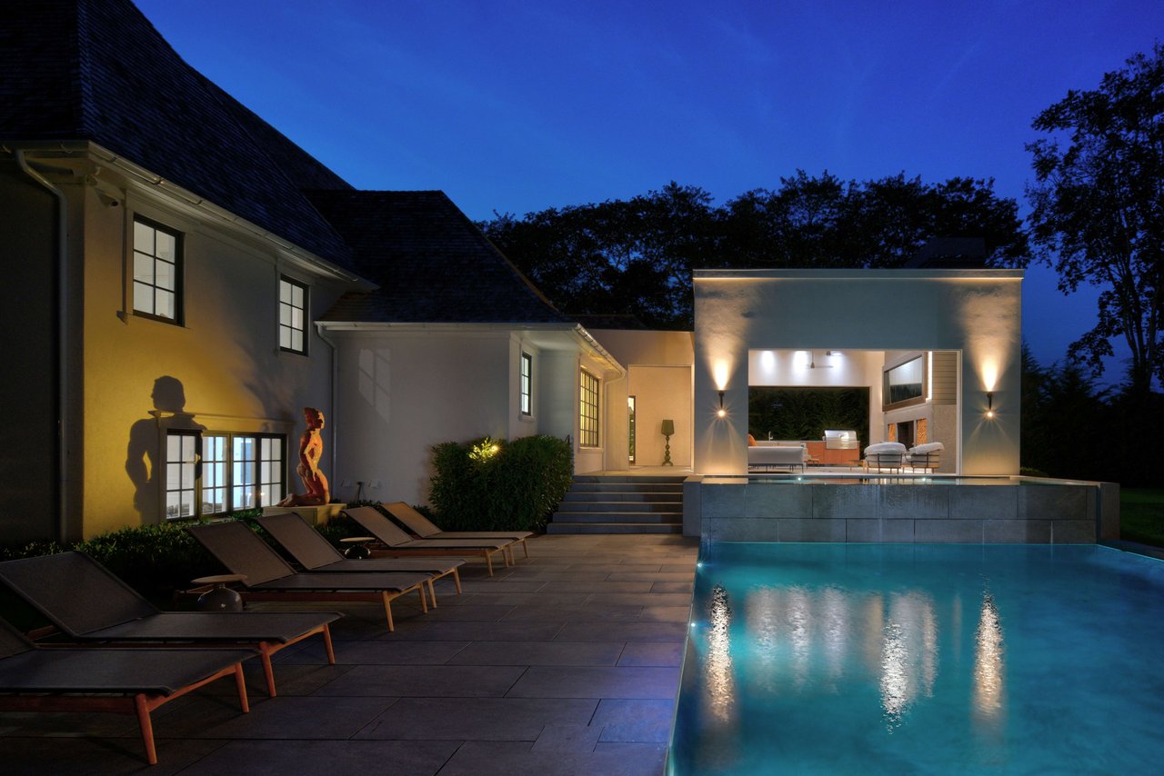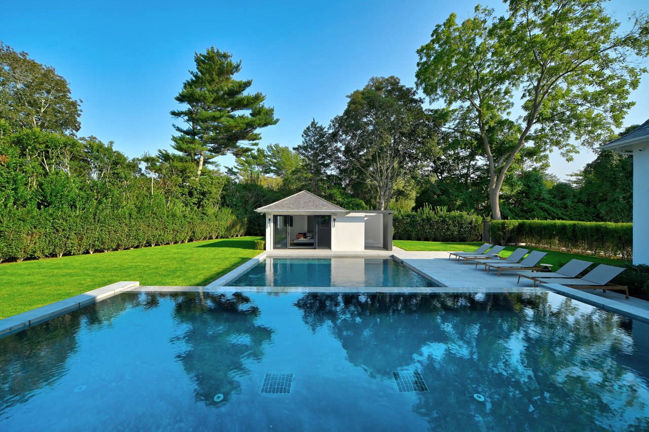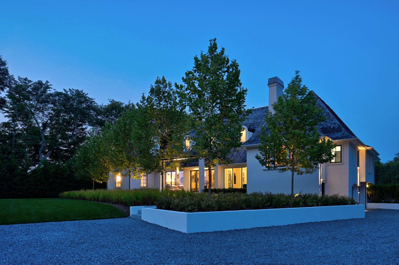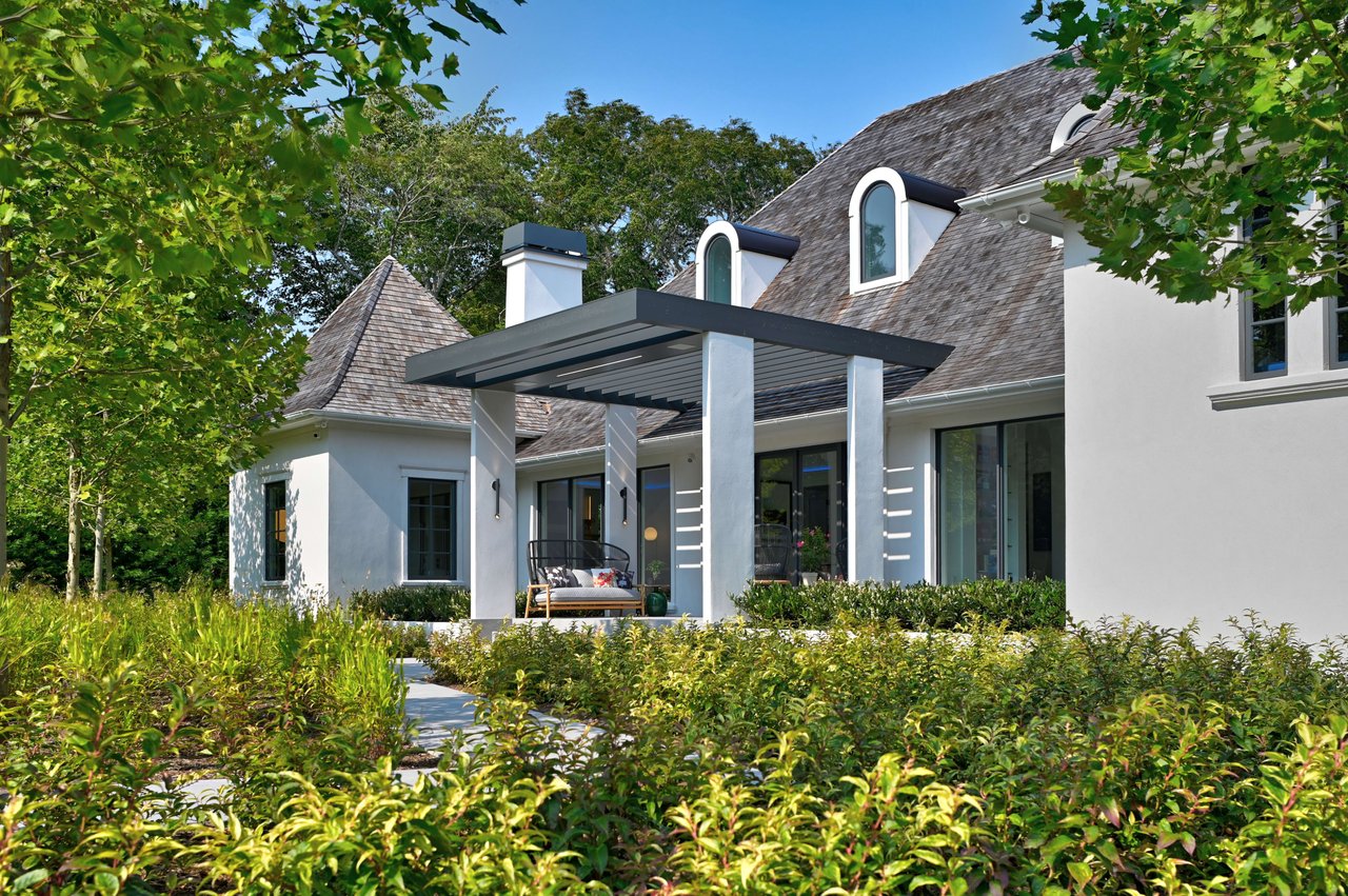 Occupying a premier position on Hither Lane-widely regarded as one of the most beautiful and private streets in the Hamptons-the estate enjoys exceptional walkability. Three ocean beaches, The Maidstone Club, village restaurants, shopping, coffee, golf, and The Jitney are all within easy reach, allowing residents to avoid summer traffic entirely-an uncommon and highly valued advantage in East Hampton. Privately gated and approached via a long, tree-lined allée, the property unfolds behind custom steel entry gates into a fully enclosed landscape of mature plantings, offering a remarkable degree of privacy, security, and quiet. Architecture & Design Spanning approximately 8,000 square feet, the residence presents a refined architectural dialogue between classic Hamptons craftsmanship and contemporary design. Traditional detailing is executed with precision, while modern elements introduce lightness, scale, and understated sophistication. Natural materials, bespoke millwork, and tailored finishes define the interiors. Glass curtain walls, soaring ceilings, and carefully proportioned volumes create a seamless flow that supports both elegant entertaining and relaxed daily living. Interiors The main level is open yet thoughtfully structured, allowing each space to feel distinct while flowing effortlessly from one to the next.