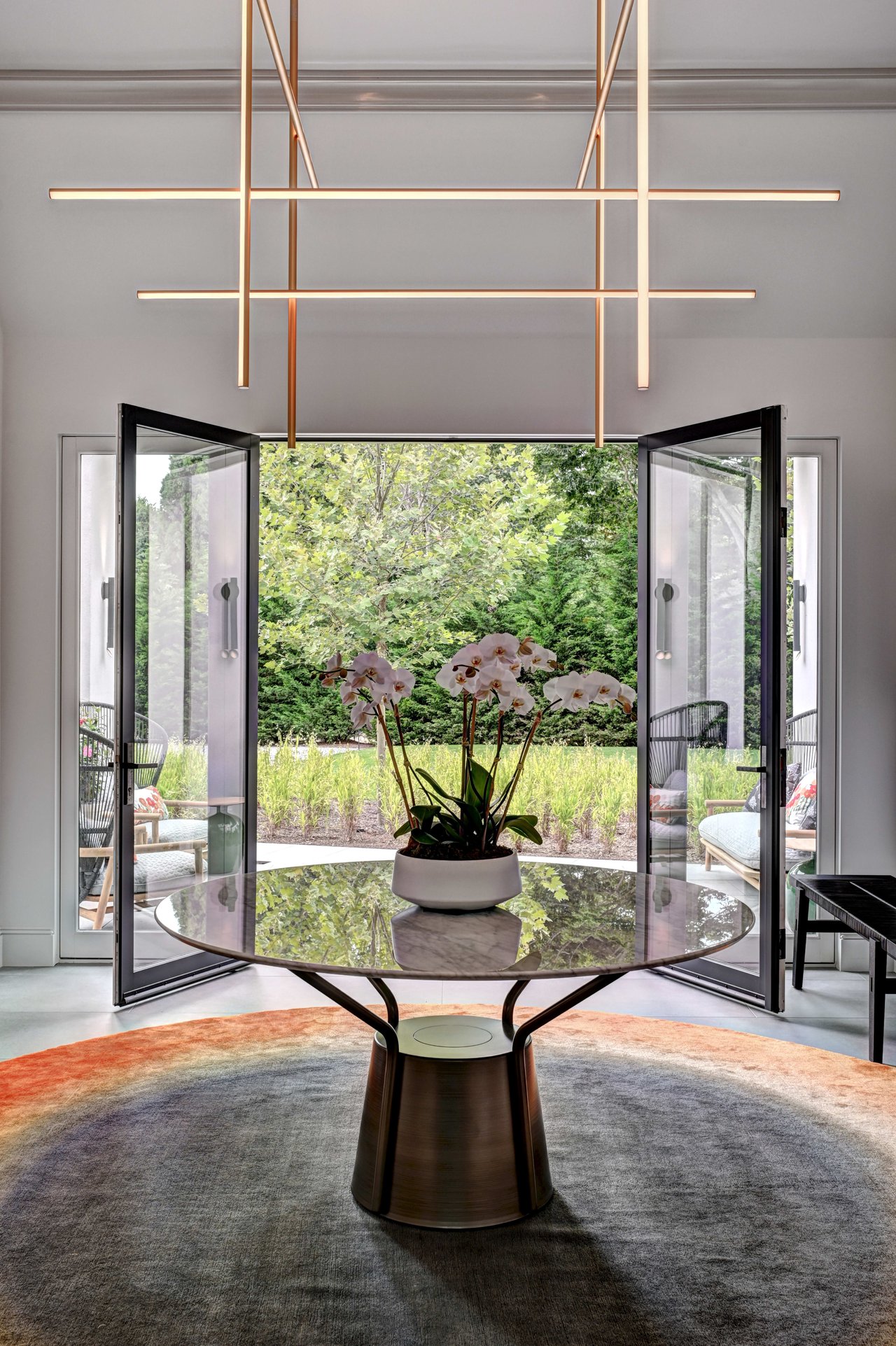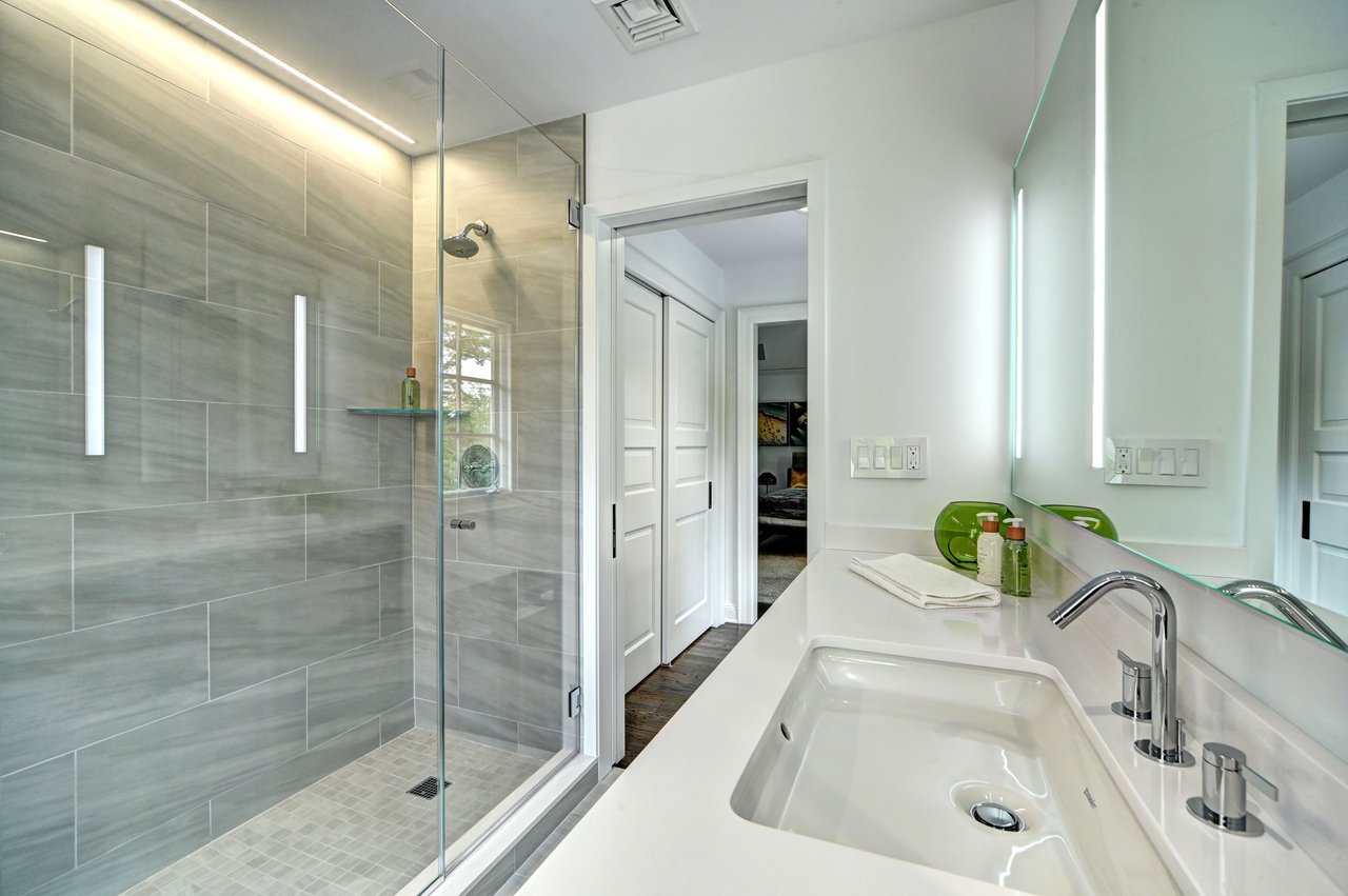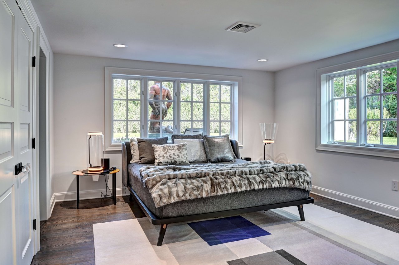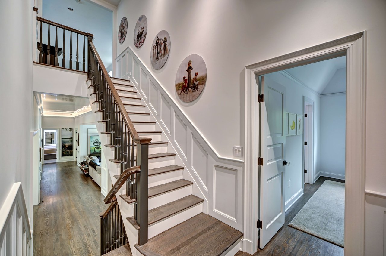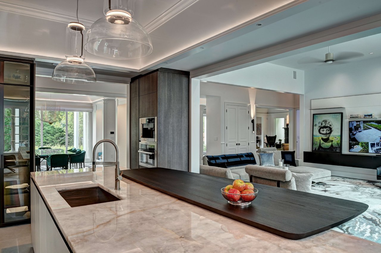 Occupying a premier position on Hither Lane-widely regarded as one of the most beautiful and private streets in the Hamptons-the estate enjoys exceptional walkability. Three ocean beaches, The Maidstone Club, village restaurants, shopping, coffee, golf, and The Jitney are all within easy reach, allowing residents to avoid summer traffic entirely-an uncommon and highly valued advantage in East Hampton. Privately gated and approached via a long, tree-lined allée, the property unfolds behind custom steel entry gates into a fully enclosed landscape of mature plantings, offering a remarkable degree of privacy, security, and quiet. Architecture & Design Spanning approximately 8,000 square feet, the residence presents a refined architectural dialogue between classic Hamptons craftsmanship and contemporary design. Traditional detailing is executed with precision, while modern elements introduce lightness, scale, and understated sophistication. Natural materials, bespoke millwork, and tailored finishes define the interiors. Glass curtain walls, soaring ceilings, and carefully proportioned volumes create a seamless flow that supports both elegant entertaining and relaxed daily living. Interiors The main level is open yet thoughtfully structured, allowing each space to feel distinct while flowing effortlessly from one to the next.