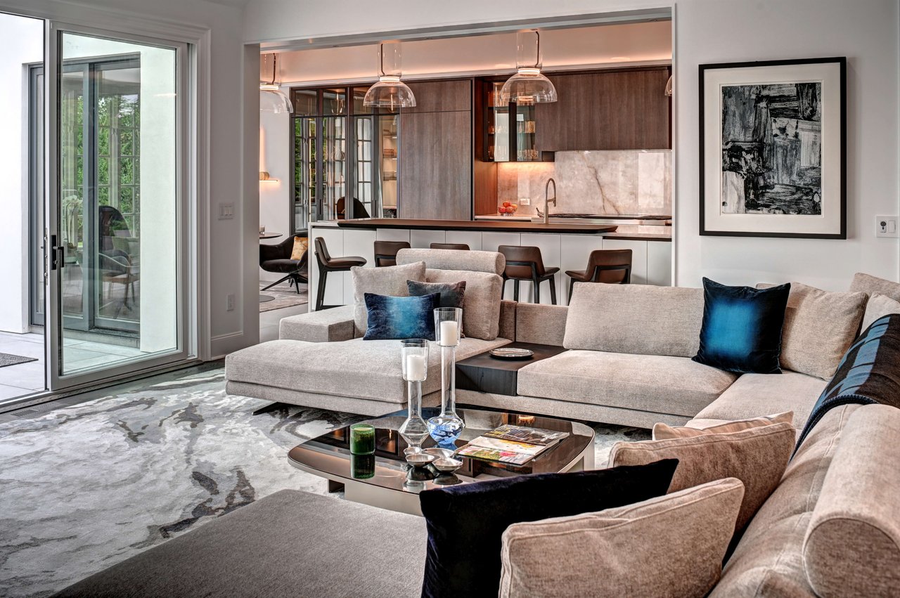 The formal living room draws inspiration from London's finest hotels, with lacquered wood-paneled walls, integrated architectural lighting, a custom wet bar, and a gas fireplace framed in Italian quartzite.