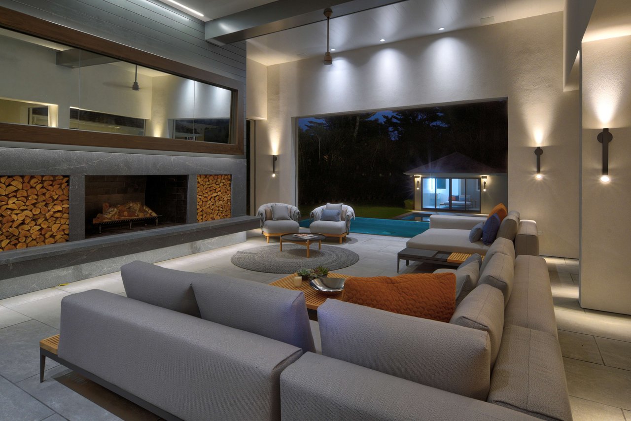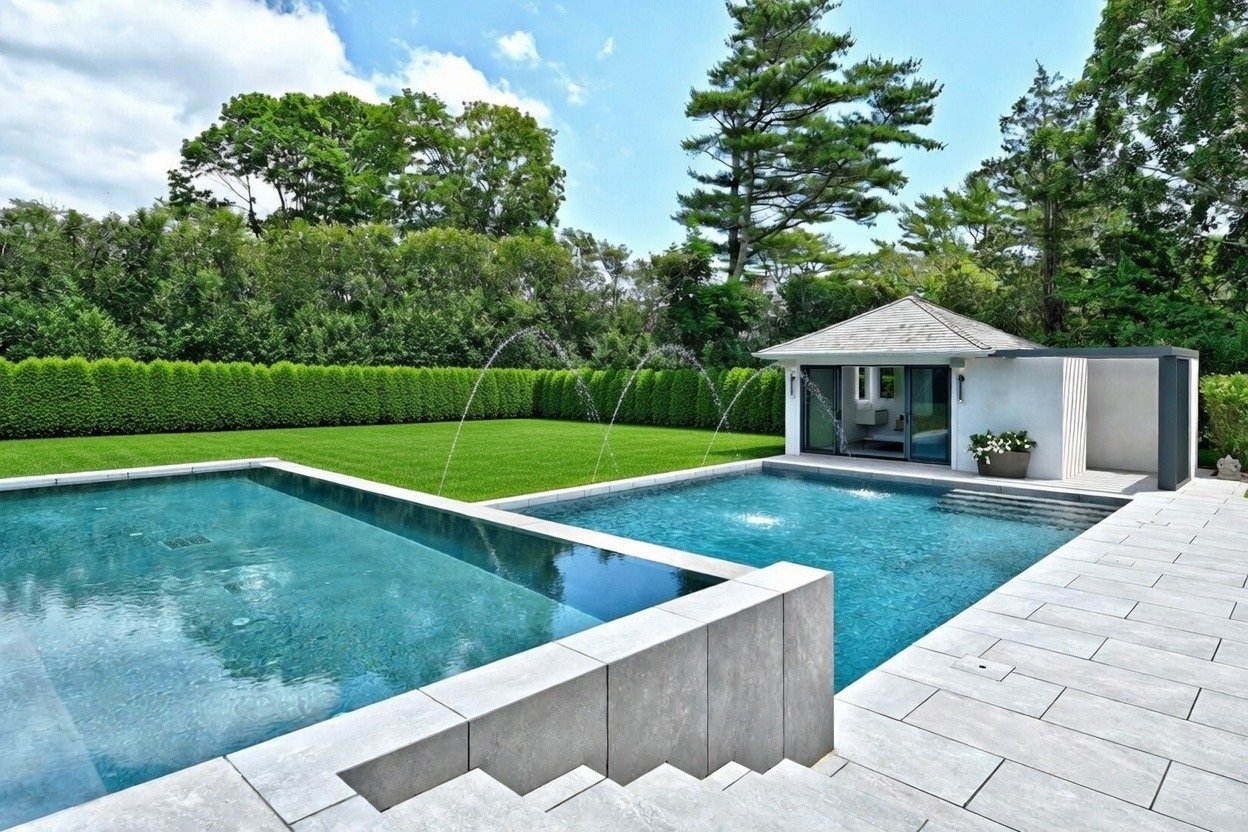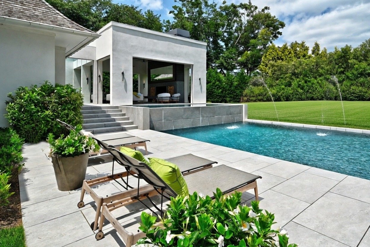 The primary outdoor living pavilion features 14-foot ceilings, a custom summer kitchen, wood-burning fireplace, and a dramatic infinity-edge heated saltwater spa. Motorized retractable screens allow seamless transition between open-air and enclosed comfort. • The pool pavilion includes a full bath, outdoor shower, and a generously scaled gunite pool, with the sound of ocean waves audible on summer evenings.
