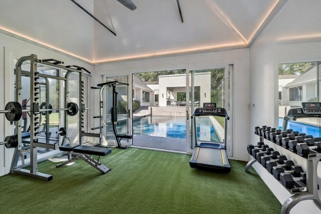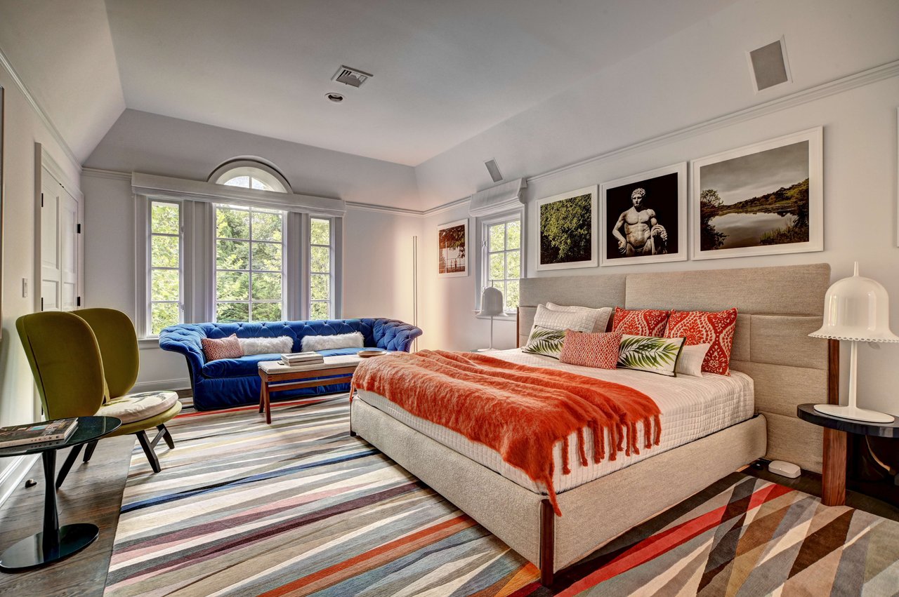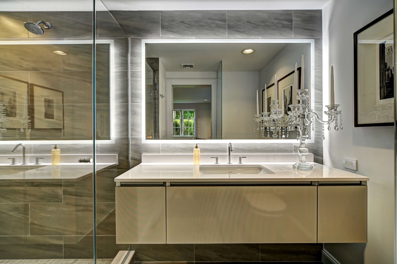 Primary Suite & Guest Accommodations The main-floor primary suite offers a serene retreat, complete with a private sculpture garden, sitting area, and spa-inspired bath featuring heated stone floors, double vanities, and a glass-enclosed shower. Two custom walk-in closets and motorized window treatments complete the space. Five additional bedroom suites, each with en-suite baths and generous closets, provide exceptional comfort and privacy for family and guests. Outdoor Living The exterior program unfolds across three distinct outdoor pavilions, designed for year-round enjoyment.