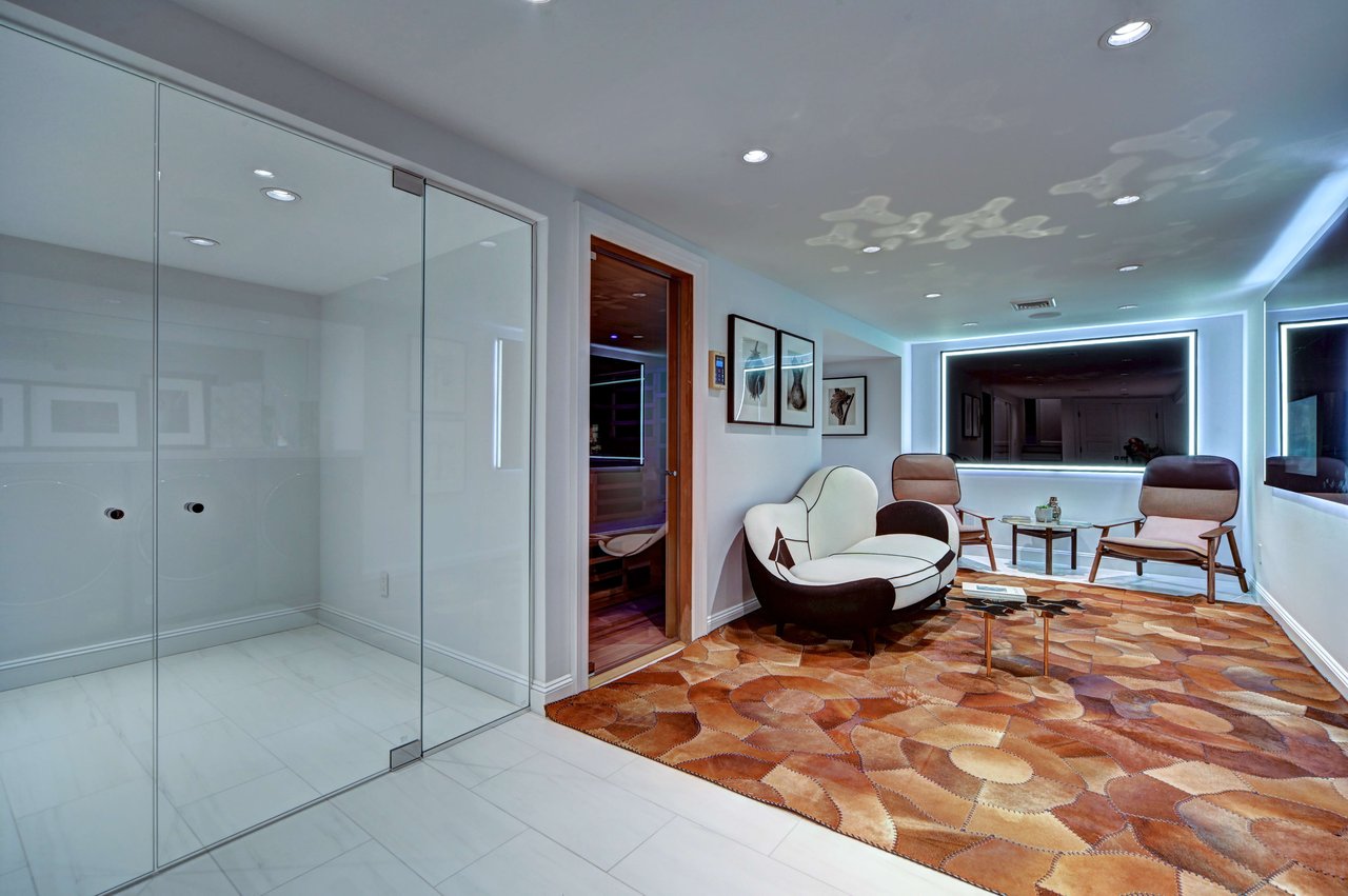 Additional amenities include a gym, wine room, sauna, cedar closets, a heated two-and-a-half-car garage, Lutron lighting, custom architectural LED systems, and comprehensive audio throughout the home and outdoor spaces.